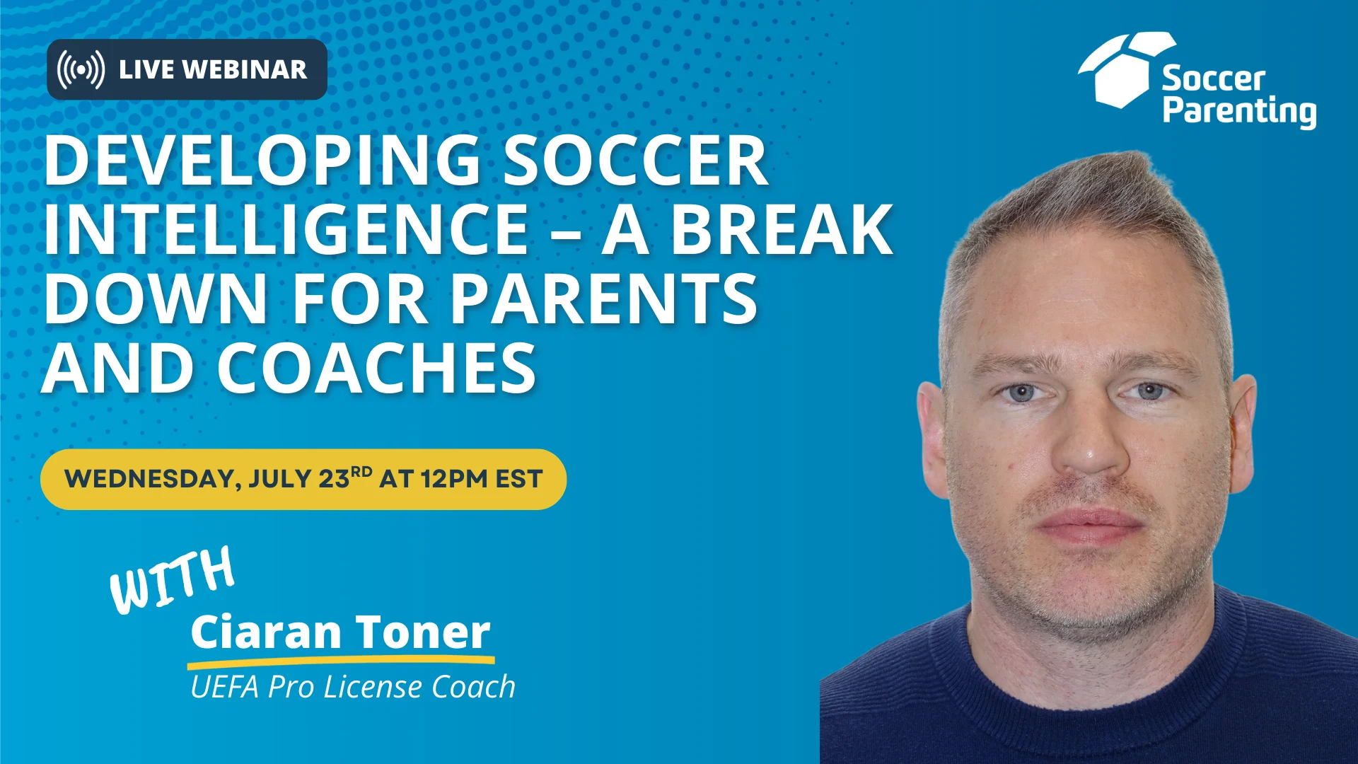 Join UEFA Pro Licensed Coach Ciaran Toner for a live, one-hour interactive session focused on Soccer Intelligence. Whether you’re a parent or coach looking to deepen your understanding of the game, this webinar will offer valuable insights into how players learn to think, read, and respond intelligently on the field.