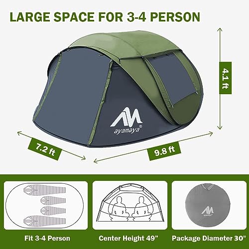 Specification: 4 Person Pop Up Tents for Camping – AYAMAYA Waterproof Instant Family Tents with Skylight & Removable Rainfly, Upgraded Large Size with 2 Doors -Automatic Easy Setup Beach Tent with Poles