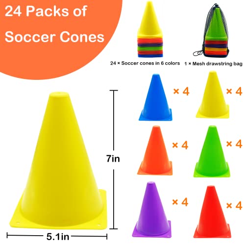 【Compact Size】Each soccer cones for training is 7″ high and 5.1″ in diameter at the base. There are 4 holes on the base of the cones for easy fixing to the field. Each disc cone is 2″ high and 7.5″ in diameter at the base. All cones can be securely stacked in the mesh drawstring bag that is provided
