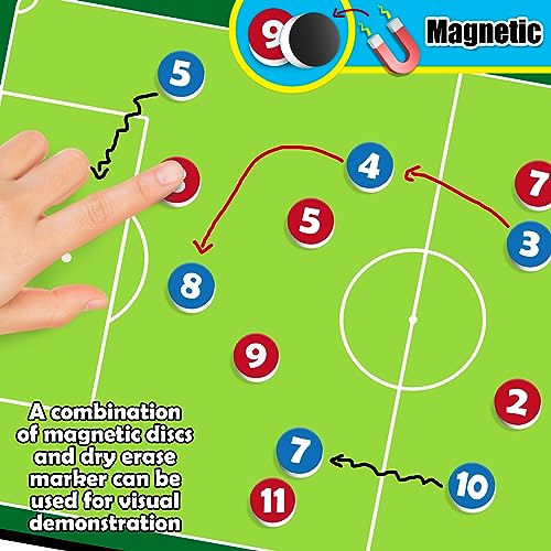 Includes 24 Magnetic Markers: 2 soccers, 1-11 Red & 1-11 Blue. Using the magnetic markers to represent players, assists coaches in strategically positioning players. We also provide a drawstring pouch for you to store magnets