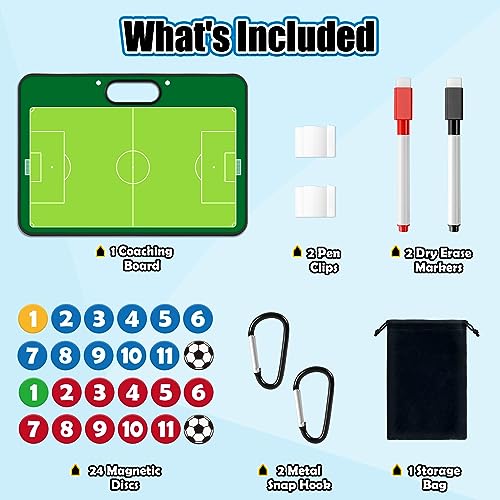 Equipment Included – This soccer whiteboard clipboard comes with 2 dry-erase markers (1 pink & 1 black), 2 pen clips, 24 magnetic discs, 1 drawstring pouch, 2 metallic snap hooks, 1 teaching board